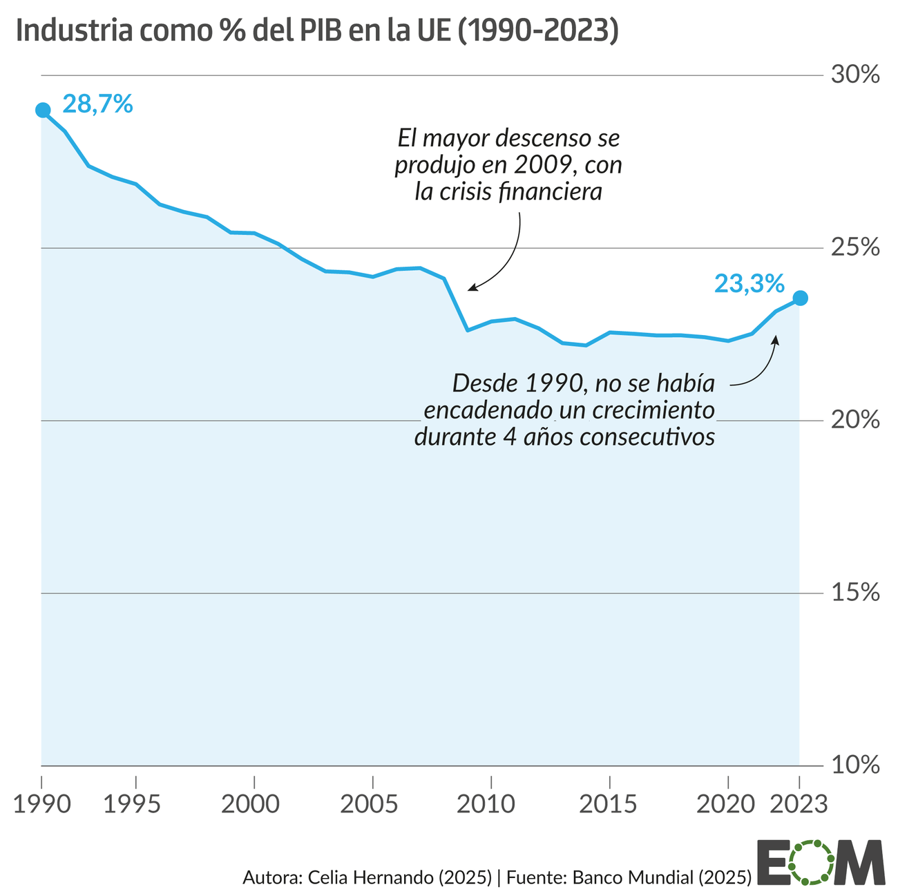 Desde finales del siglo XX, la aceleración de los procesos de deslocalización ha provocado que el peso de la industria en el PIB comunitario haya caído de casi un 30% a un 23% en 2023. La crisis financiera de 2008, que provocó una fuerte caída en la construcción, aceleró esta tendencia.