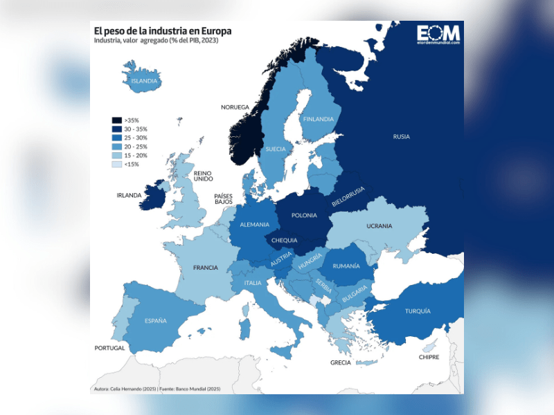 Otros Estados de Europa, aunque con una contribución menor, también cuentan con una industria importante que representan entre el 25% y el 30% de su PIB. Sin embargo, una alta proporción de la industria en el PIB no siempre es sinónimo de una economía fuerte, ya que puede reflejar una excesiva dependencia de sectores específicos o una falta de diversificación. Por ejemplo, Alemania, uno de los motores industriales del continente y que atraviesa una importante crisis económica, tiene una industria que representa el 27% de su PIB.