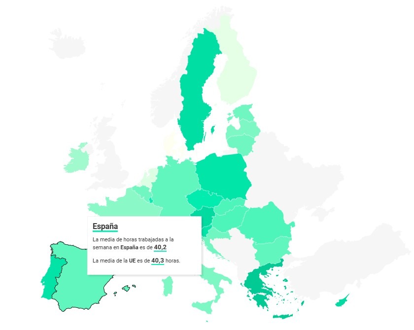 La media de horas semanales trabajadas en España se sitúa en 40,2, cerca de la media de la jornada laboral de Europa, que se encuentra en 40,3, según datos de Eurostat de 2024.